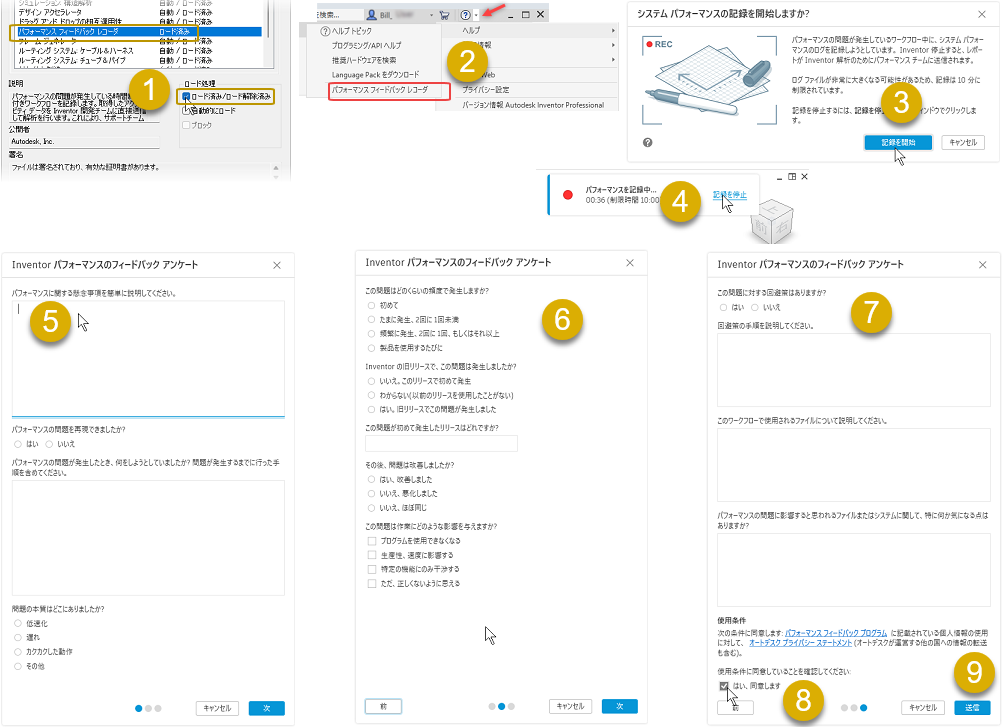 パフォーマンス フィードバック レコーダがロードされていれば、レコーダをアクティブにしてパフォーマンスの問題を実証し、その情報をレビューのためにパフォーマンス チームに提出することができます。