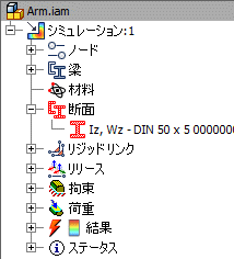 の順にクリックします。アセンブリは自動的に梁計算モデルに単純化されます。グラフィックス ウィンドウには、梁、ノード、および重心記号が表示されます。ステータス フォルダには、不十分な梁材料および断面が表示されます。