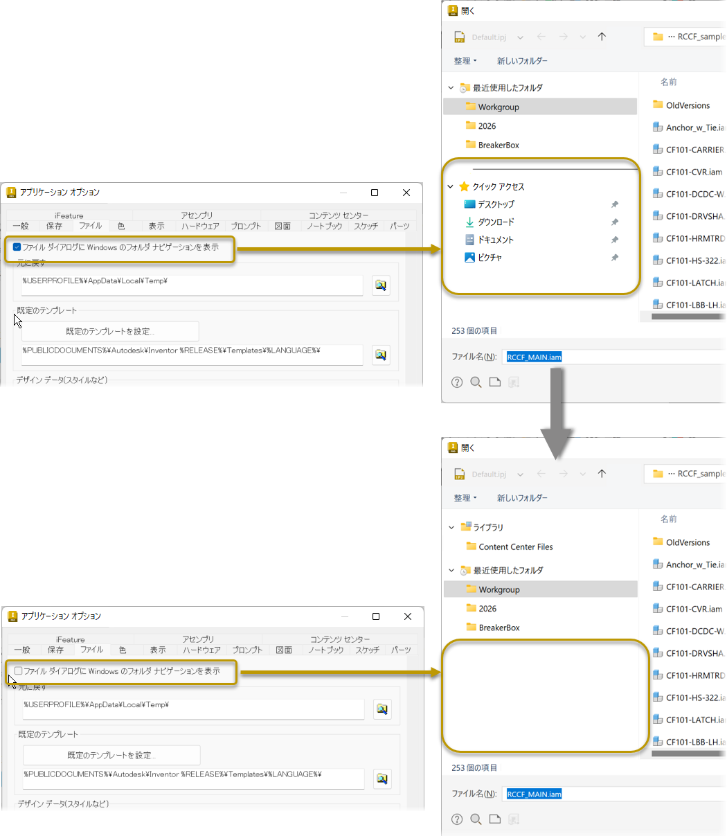 新たに追加された[アプリケーション オプション] > [ファイル]タブの設定 [ファイル ダイアログに Windows フォルダ ナビゲーションを表示] を使用して、[開く]ダイアログ内の Windows ナビゲーション セクションの表示をコントロールできるようになりました。