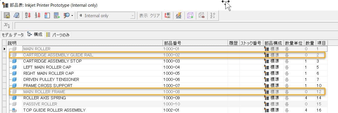 部品表で数量がゼロの項目を区別するのがより簡単になりました。数量がゼロの行の背景色が他の行の背景色とは異なります。