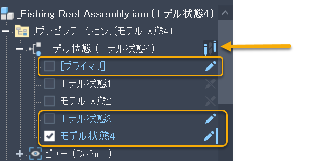 以前は、テキストを表示することでどのモデル状態が編集中なのかをすばやく知ることは困難でした。編集中のモデル状態が青色で表示されるようになりました。なお、この変更はモデル状態にのみ適用され、iComponent、ビュー、または位置には影響しません。