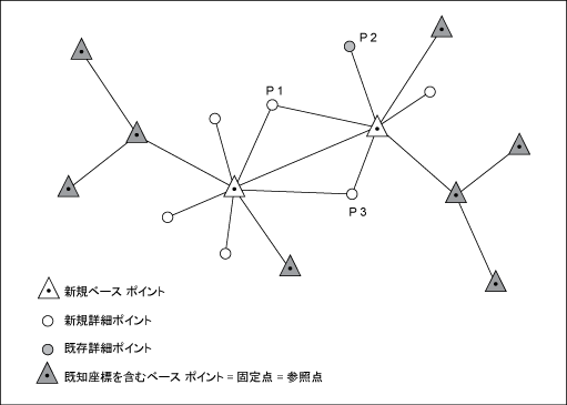 参照ポイント—データベースに保存された固定ポイント調整計算を始める前に、データベースで各ベース ポイントの参照ポイントを検索します。データベースに参照されないベース ポイントは、調整処理で新規ポイントとして導入されます。