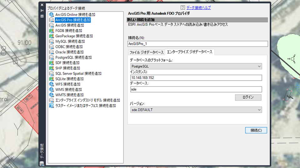 FDO ArcGIS Pro は、AutoCAD Map 3D 2026 ツールセットで導入された新しい FDO プロバイダです。このプロバイダを使用すると、ファイル ジオデータベースまたはエンタープライズ ジオデータベース(Oracle、PostgreSQL、SQL Server など)に格納されている GIS データにアクセスできます。データをマップに追加した後、データを変更、解析、およびスタイル設定できます。フィーチャの属性およびジオメトリに対する変更は、データ ソースにセーブ バックできます。