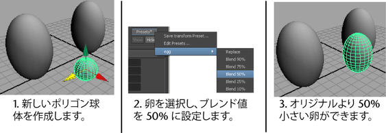 アトリビュート エディタ(Attribute Editor)を使用すると、プリセットを保存し再適用することができます。プリセットとは、1 つのノードから保存して他のいくつのノードにでも再適用できるアトリビュート設定の集まりのことです。
