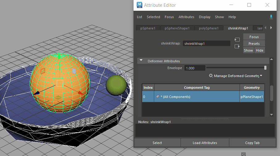 デフォーマをジオメトリに追加すると、デフォーマを新しいジオメトリまたは減衰で修正または更新できるように、デフォーマ アトリビュート(Deformer Attributes)ウィジェットがアトリビュート エディタ(Attribute Editor)のデフォーマ(Deformer)タブに表示されます。