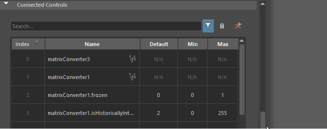 - 行列コンバータに接続されたコントロールを表示できます。コントロール コレクタ/ML デフォーマによって使用されるすべてのコントロールのリストを表示する場合に使用します。すべての列を表示するには、アトリビュート エディタ(Attribute Editor)のサイズ変更が必要になる場合があります。