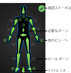確認エラーのトラブルシューティングおよびキャラクタ(Character) ビューの各ノードへのボーンのマッピングに関する情報は、「HumanIK キャラクタの構造」トピックを参照してください。