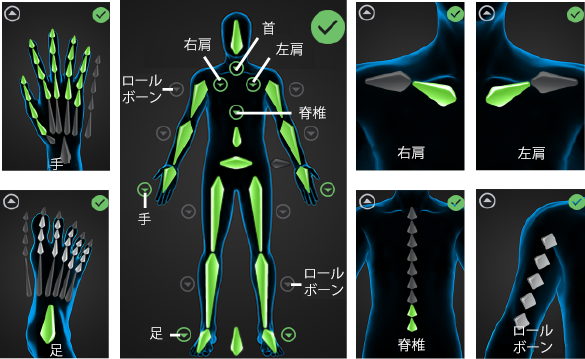 異なるボディ パーツにボーンを追加するために、詳細ビューに切り替えることができます。特定のボディ パーツのビューに切り替えるには、円で囲まれた矢印ボタン