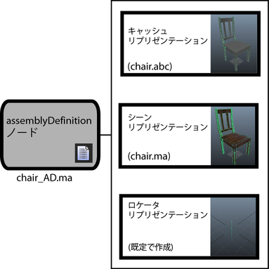 プロダクション アセットとそのさまざまなアセンブリ リプリゼンテーションに関する情報は、アセンブリ定義(assemblyDefinition ノード)に格納されています。アセンブリ定義により、プロダクション アセットのさまざまなリプリゼンテーション間を切り替えることができます。Maya シーンには 1 つの assemblyDefinition ノードのみを含めることができるため、各アセンブリ定義は個別の .ma または .mb シーン ファイルとして保存する必要があります(「アセンブリ定義を作成する」を参照)。