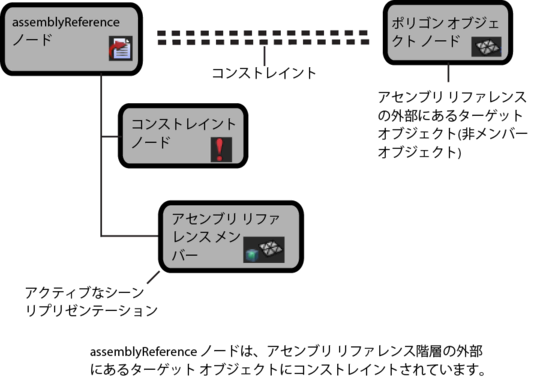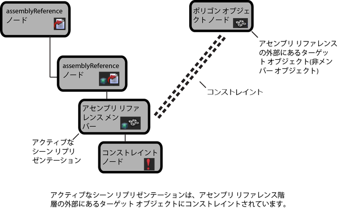 最上位の assemblyReference ノードがターゲット オブジェクトまたはコンストレイントされたオブジェクトである場合、リプリゼンテーションが切り替えられてもコンストレイントの動作は存続します。たとえば、assemblyReference ノードがターゲット オブジェクトにコンストレインされている場合、アセンブリ リプリゼンテーションがシーンリプリゼンテーションからキャッシュリプリゼンテーションに切り替わっても、コンストレイントの動作は変更されません。