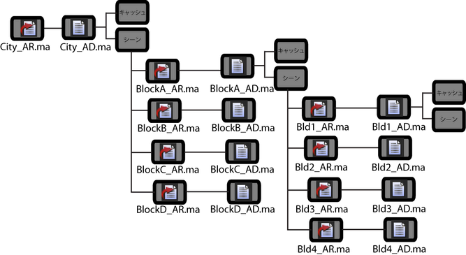次の図に示されたシーン アセンブリ階層は、City_AR.ma assemblyReference ノードによって最上位で定義されています。この配置では、City_AR.ma assemblyReference ノードから、 Bld_AD.ma で定義されたシーン リプリゼンテーションに切り替えることができます。