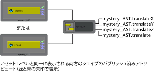 アセットを使用すると、1 つのオブジェクトに関連するすべてのノードを単一のアセット ノードに配置し、その内部ノード アトリビュートのサブセットをアセット自体にパブリッシュできます。これによって、表示する必要のある情報のみを表示したカスタム インタフェースが作成されます(詳細については、アトリビュートをパブリッシュまたはパブリッシュ解除するを参照)。