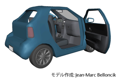 車のモデルのアセットで、車体、インテリア、車軸、ライト、ドアのグループ ノードをカプセル化します。