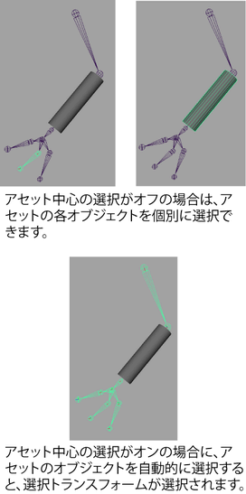たとえば、上位階層で、pSphere1 は asset1 のルート ノードとしてパブリッシュされています。アセット中心の選択(Asset centric selection)がオンの場合に、pCylinder1 を移動ツール(Move Tool)で選択すると、1 つまたは複数のパブリッシュ済みのトランスレーション アトリビュートがあるときは、pCube1 が選択されます。pSphere1 もパブリッシュ済みのトランスレーション アトリビュートを持つ場合であっても、pCube1 が選択されます。これは、適切なパブリッシュ済みアトリビュートが 1 つ上の階層にある最初のノードであるためです。
