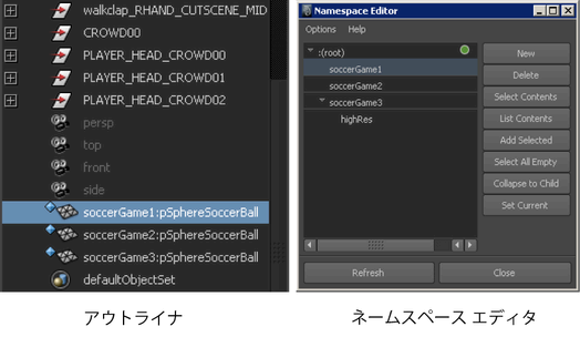 ネームスペースを使用すると、2 つのオブジェクトが別のネームスペースにあれば、同じシーンで同じ名前を付けることができます。たとえば、pSphereSoccerBall という名前で、異なるネームスペース soccerGame1 と soccerGame2 を持つ 2 つのオブジェクトをシーンに持たせることができます。