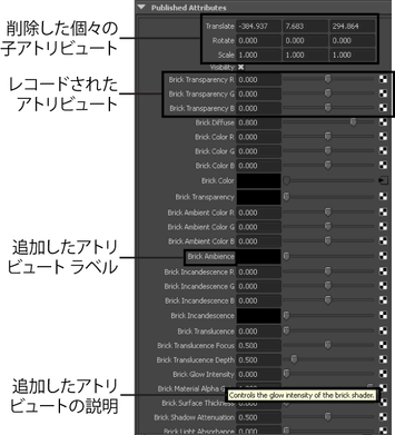 任意の XML エディタでアセットのテンプレート ファイルを編集できます(テンプレート ファイルの詳細については、アセット テンプレートのパーツとテンプレート ファイル フォーマットを参照)。次のイメージは、テンプレート ファイルにいくつかの簡単な修正を行った後の同じアセットのアトリビュート エディタ(Attribute Editor)です。