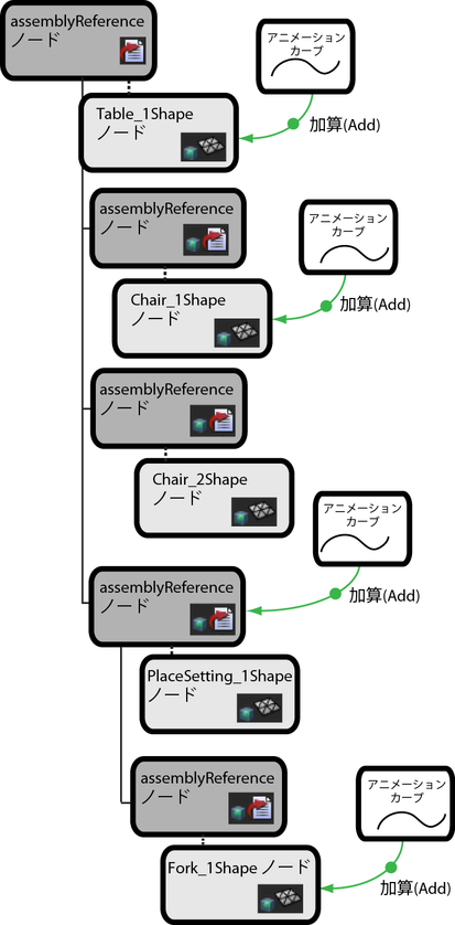 アニメーション カーブを assemblyReference ノードおよびシーン リプリゼンテーションに含まれているノードに追加できます。これらの接続は、アセンブリ リファレンス階層のすべてのレベルでノードに対して行うことができます。アニメーション カーブをノードに接続する編集は、上位のアセンブリ リファレンス ノードによって保存およびトラックされます。アニメーション カーブ データは、assemblyReference ノードまたはシーン リプリゼンテーションのソース ファイルにあります。
