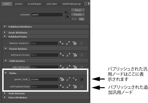 高度なアセットの場合、アトリビュート エディタ(Attribute Editor)で直接ノードをパブリッシュすることもできます。