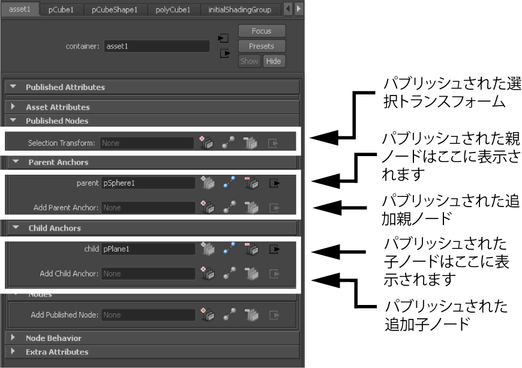 アトリビュート エディタ(Attribute Editor)のアセット タブのパブリッシュされたノード(Published Nodes)セクションで、親アンカーの追加(Add Parent Anchor)または子アンカーの追加(Add Child Anchor)の横にあるパブリッシュ ボタン(