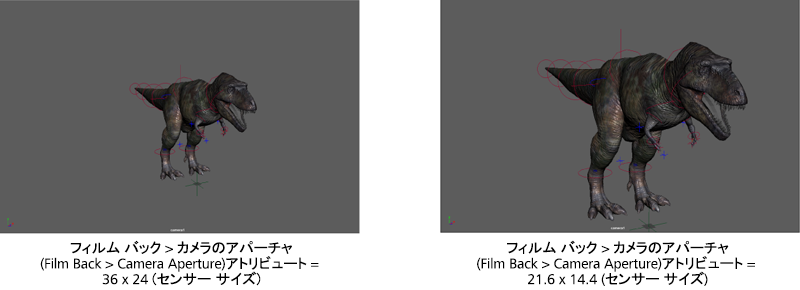 フィルム バック > カメラのアパーチャ(Film Back > Camera Aperture)アトリビュートは、書き出し中のフィルム バックの一部を表します。このアトリビュートをカメラのセンサのサイズに設定します。この値はインチまたはミリメートル単位で入力できます。この値が小さいほど、センサーでキャプチャされるビュー アングルが小さくなるため、オブジェクトが近くに表示される場合も、パースは誇張されません。次の図に、36 x 24 と 21.6 x 14.4 (40% 縮小)のセンサー サイズの違いを示します。