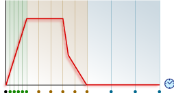 赤色: 圧力プロファイル、緑色: 充填過程、茶色: 保圧過程、青色: 冷却過程。