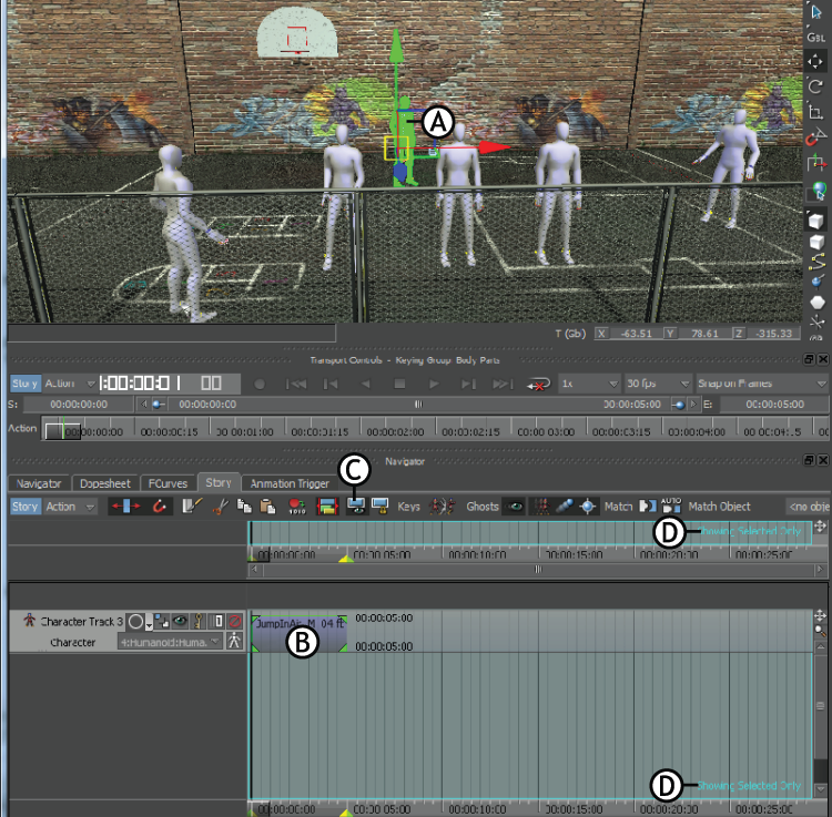 Viewer ウィンドウと Story ウィンドウ A.選択したキャラクタ B.選択したキャラクタのアニメーション トラック C.Filtering by selection アイコン D.選択したオブジェクトのトラックのみが表示されることを通知するメッセージ