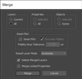 Merge ダイアログ ボックスは、Animation Layer ツールバーの Merge ボタンをクリックするか、Animation Layer エディタを右クリックしてコンテキスト メニューから Merge を選択すると表示されます。
