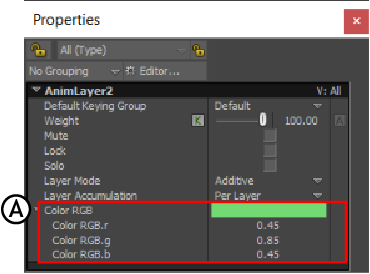 Animation Layer エディタに表示されるアニメーション レイヤのプロパティはすべて、レイヤを選択すると、Properties ウィンドウにも表示されます。さらに、Properties ウィンドウには Color RGB プロパティも表示されます。