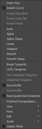 FCurves コンテキスト メニューには、キーフレームやファンクション カーブを設定する追加のオプションが表示されます。このメニューを表示するには、FCurves ペイン内で右クリックします。