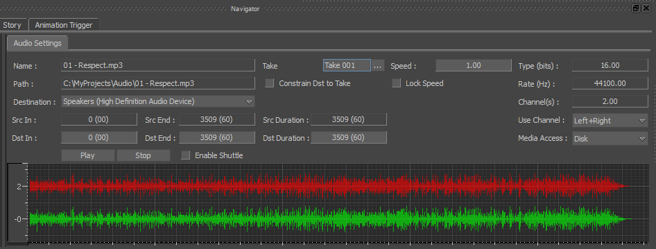 Audio 設定は、Navigator Scene ブラウザでオーディオ クリップを選択したとき、Navigator ウィンドウに表示されます。Audio 設定は、オーディオ プロパティとオーディオ波形で構成されます。