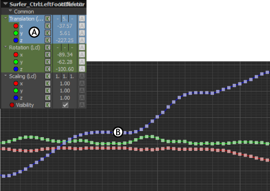 マーカーの移動ファンクション カーブにプロットされたテイク A.選択した移動ファンクション カーブ B.表示されたアニメーション ファンクション カーブ