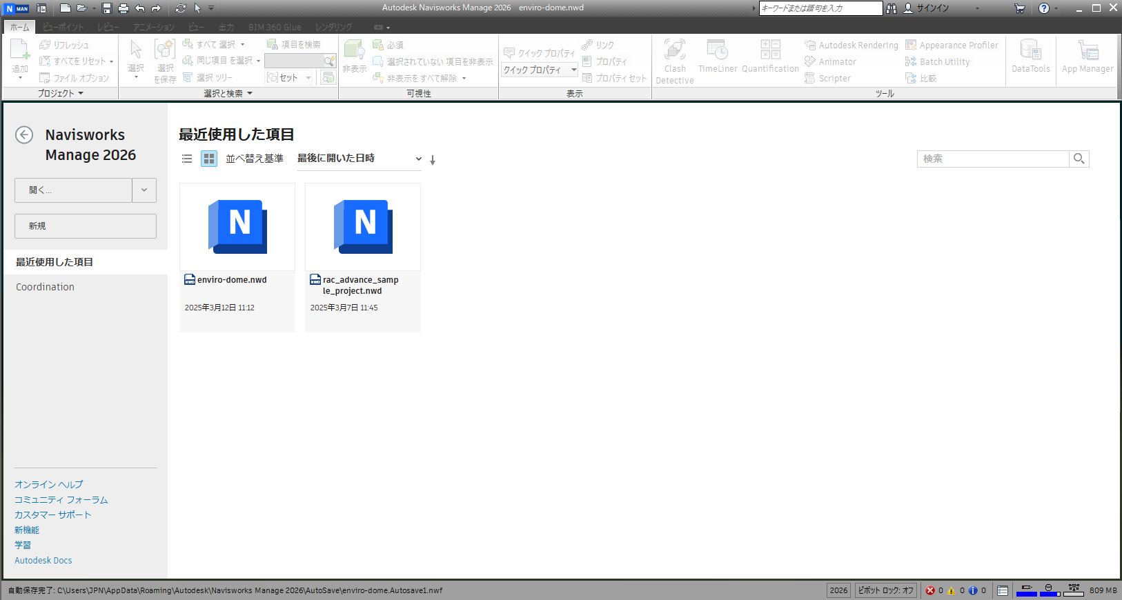 Navisworks ホームでは、モデルに関連する情報にアクセスしたり管理することができます。