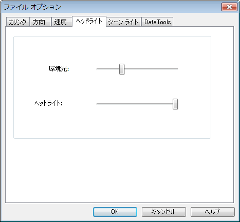 [ファイル オプション]ダイアログ ボックス([ホーム]タブ > [プロジェクト]パネル)で、[ヘッド ライト]のプロパティ値をカスタマイズできます。