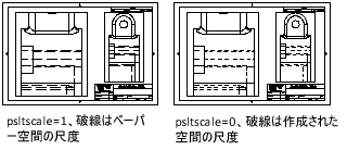 ペーパー空間では、2 つの方法で線種の尺度を設定することができます。尺度は、オブジェクトが作成された(モデルまたはペーパー)空間の図面の単位に基づいて設定することができます。また、ペーパー空間の単位に基づいて一律に線種の尺度を使用することもできます。システム変数 PSLTSCALE を使用して、別々のビューポートにおいて異なる尺度で表示されているオブジェクトに対して、同一の線種の尺度を使用することができます。また、3D 表示での線表示にも影響します。