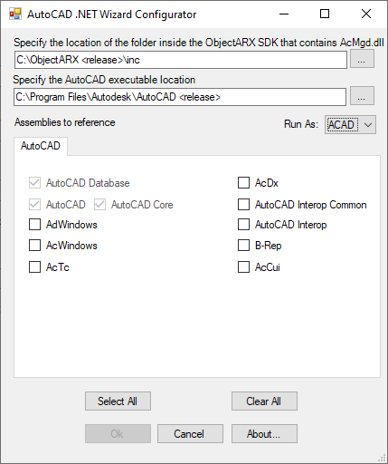 - [AutoCAD .NET Wizard コンフィグレータ] ダイアログ ボックスで、プロジェクトを参照するライブラリを指定します。