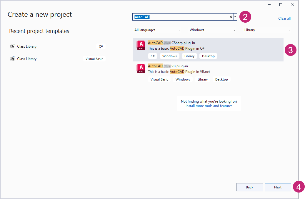 - [新しいプロジェクトを作成]ダイアログ ボックスで、[検索]ボックスをクリックし、AutoCAD と入力します。