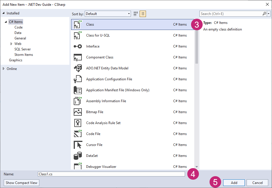 クラス モジュールや Windows フォームなどの新しい項目をプロジェクトに追加できます。その際に、項目のプロパティ(名前など)を更新したり、適切なコードを入力する必要があります。新しい項目に名前を付けるときは、今後のアプリケーションで他の開発担当者がその項目を使用する可能性があることを念頭に置いておく必要があります。社内で決められた命名規則や Microsoft が設定した標準に従う必要があります。