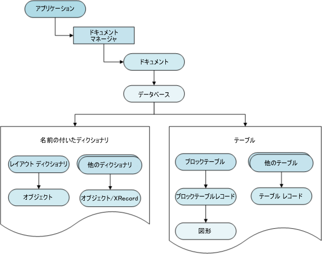 Database オブジェクトには、AutoCAD のすべてのグラフィカル オブジェクトおよびほとんどの非グラフィカル オブジェクトが含まれます。データベースに含まれる一部のオブジェクトは、図形、シンボル テーブル、名前の付いたディクショナリです。データベース内の図形は、図面上のグラフィカル オブジェクトを表します。図形の例は、線分、円、円弧、文字、ハッチング、ポリラインなどです。ユーザは画面上に図形を表示して操作することができます。