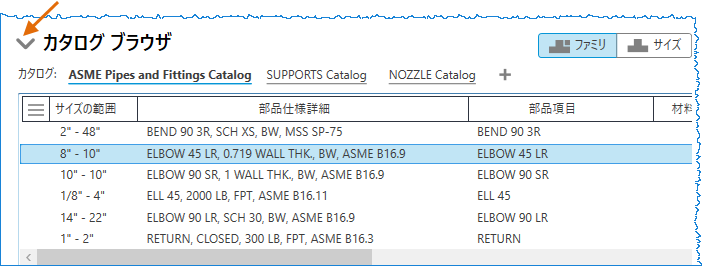 エキスパンダーをクリックすると、[カタログ ブラウザ]を展開または折りたたむことができます。[カタログ ブラウザ]を折りたたむと、コンポーネントを編集するための[スペック エディタ]および[カタログ]タブが見やすくなります。