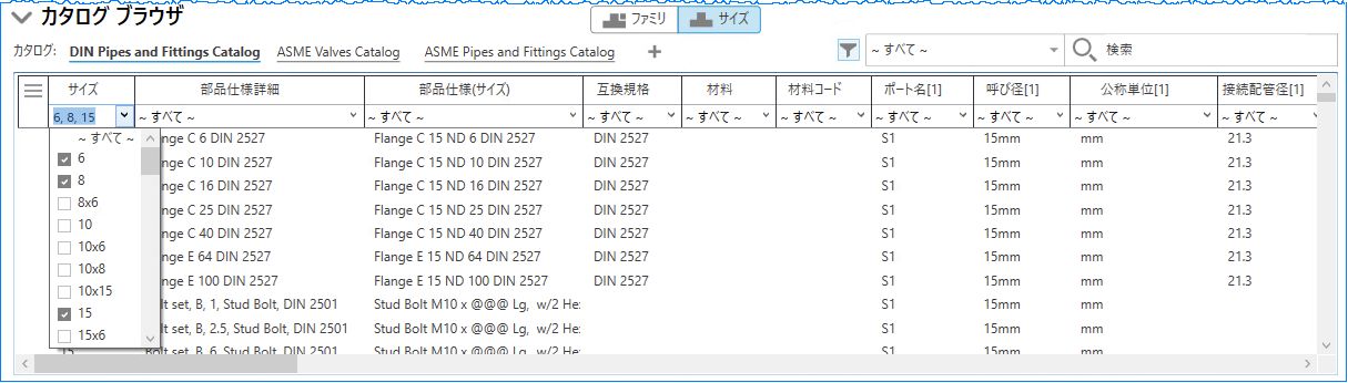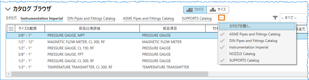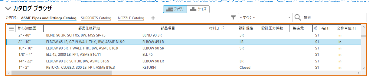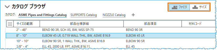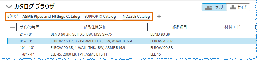 [ファミリ]タブと[サイズ]タブを切り替えることで、パーツ ファミリ別またはパーツ サイズ別にコンポーネント リストを表示できます。