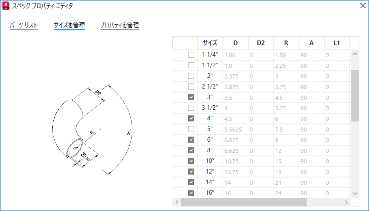 スペック シートで選択したパーツのサイズを管理します。