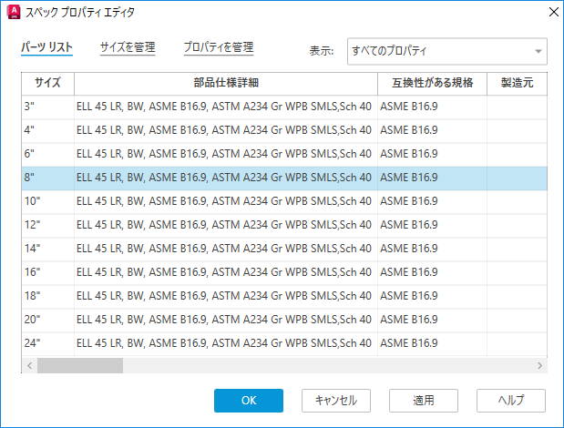 パーツ ファミリ プロパティ、パーツ サイズ プロパティ、カスタム プロパティ、またはすべてのプロパティが表示されます。