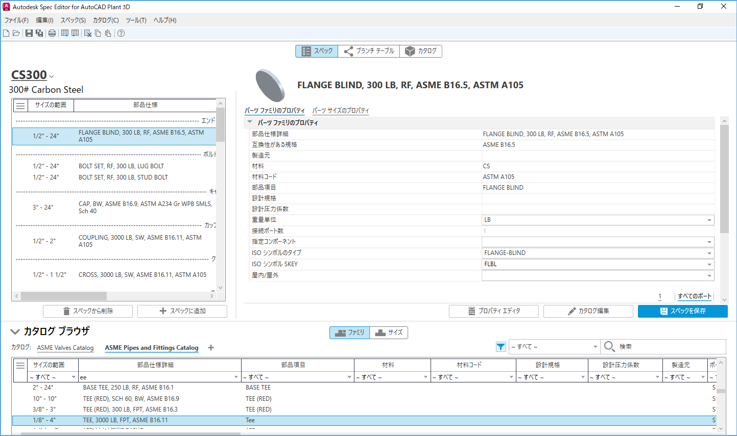 スペック エディタを使用すると、カタログからパーツを追加して、スペック シートを作成できます。その後、特定の配管サイズのためにルートを作成するときに、配管の際に使用する継手を指定できます。
