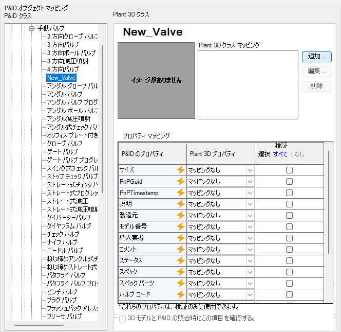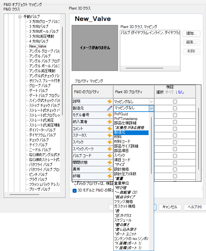 - [P&ID クラス]で、ツリーを展開して新しい P&ID オブジェクトをクリックします(例: New_Valve)。