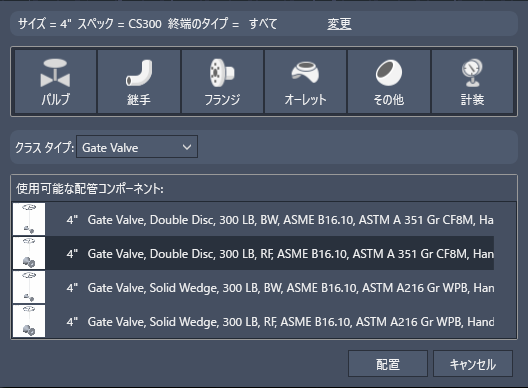 - [使用可能な配管コンポーネント]で、コンポーネント([ゲート バルブ、Solid Wedge、300LB、RF]など)をクリックします。