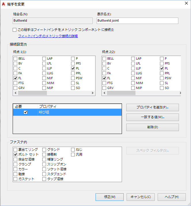 フィート/インチからメトリックへの接続をサポートする継手タイプは、同一単位の継手タイプとは異なります。これにより、150#、10PN のような適合するプロパティを指定することができます。