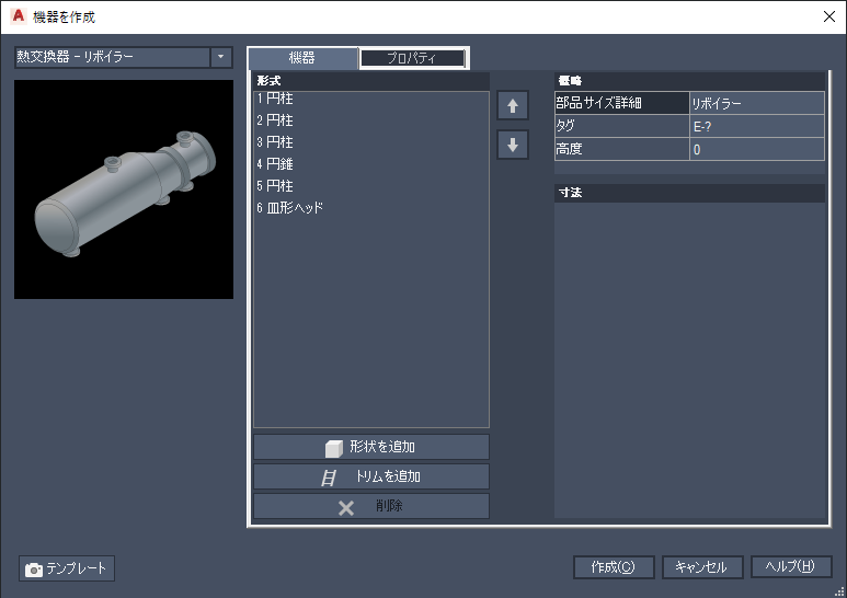 機器のプレビュー イメージが表示されます。既存の機器パターンを持つ機器を選択すると、プレビュー イメージに寸法が示されます。