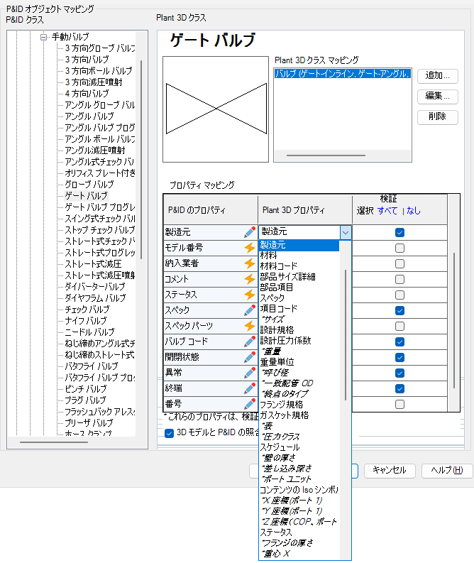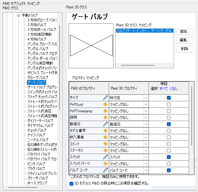 マップされた項目のプロパティ マッピングの検証プロセスを管理するには、[3D モデルと P&ID の照合時にこの項目を確認する]オプションを選択またはクリアします。