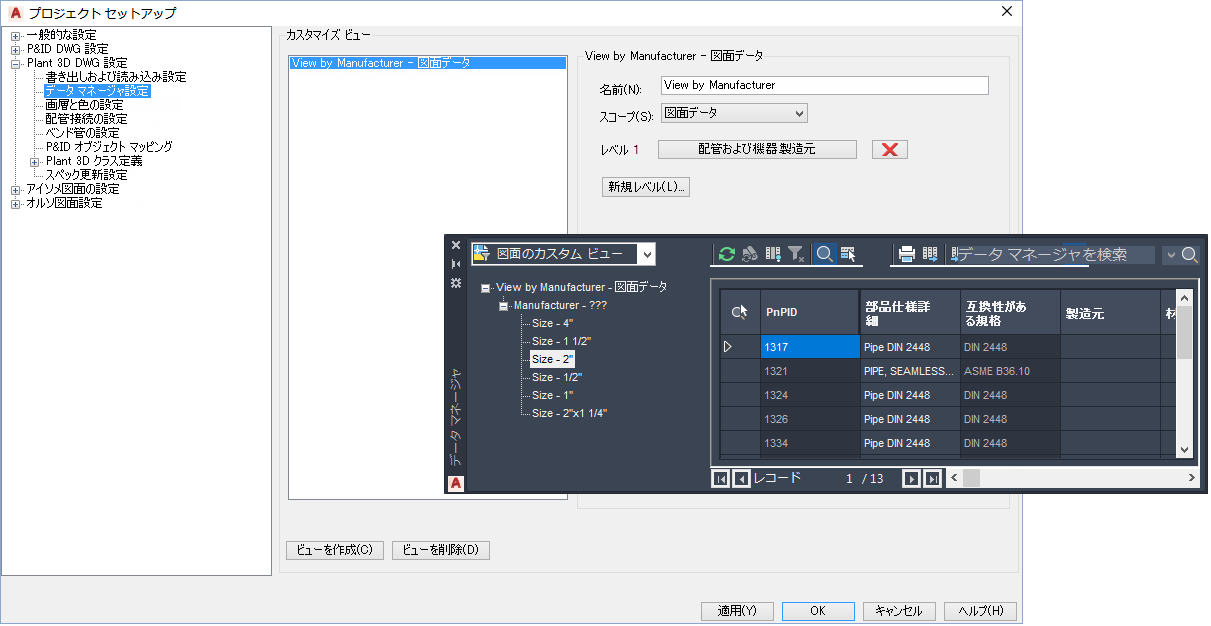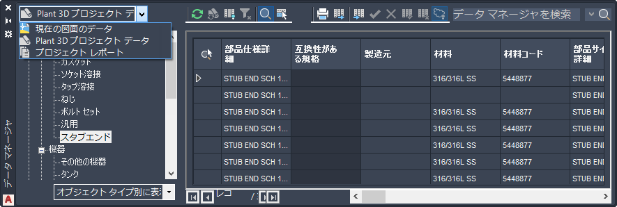 [データ マネージャ]を使用して、データをさまざまに表示することができます(プロジェクト別、図面別、組み込みレポート別など)。