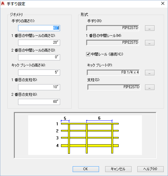 選択した手すりのジオメトリ設定を編集します。括弧内に示されている数値は、プレビュー イメージ内に表示されているジオメトリに対応しています。